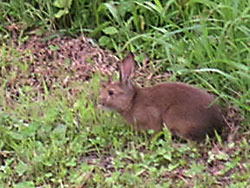昼休みをしていると、ひょこひょこと野うさぎが現れました。私がカメラを持ってベランダに出ると、急に緊張した顔つきになり、逃げていきました。見た目はかわいいのですが、冬になると、果樹の苗木の皮をかじり、何十本も枯らせてしまう恐ろしい生き物です。 |