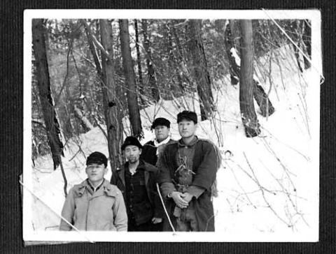 | 3代目清の子供は、女の子ばかりでした。そのため、長女の雅子が婿を迎えました。その婿が4代目の四朗です。四朗はもともと中学校の教員でした。そのため、婿に来てから、農作業に慣れるまでしばらく時間がかかったそうです。写真は、杉林の下刈りを行っているところです。一番右の長身の男性が四朗です。 |